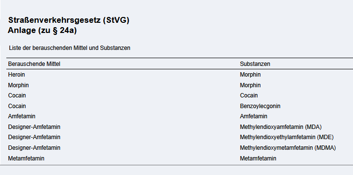 Załącznik do § 24a StVG wymienia między innymi substancje takie jak: